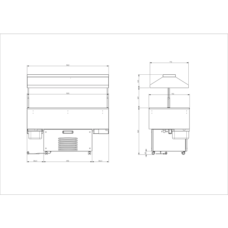 Éclairage led sous la cloche. Équipement prévu pour bacs GN 1/4, 1/3, 1/2, 2/3, 1/1 et 2/1, hauteur max 150 mm. Les bacs (jusqu'à une hauteur de 65 mm) peuvent être superposés sur différents niveaux.