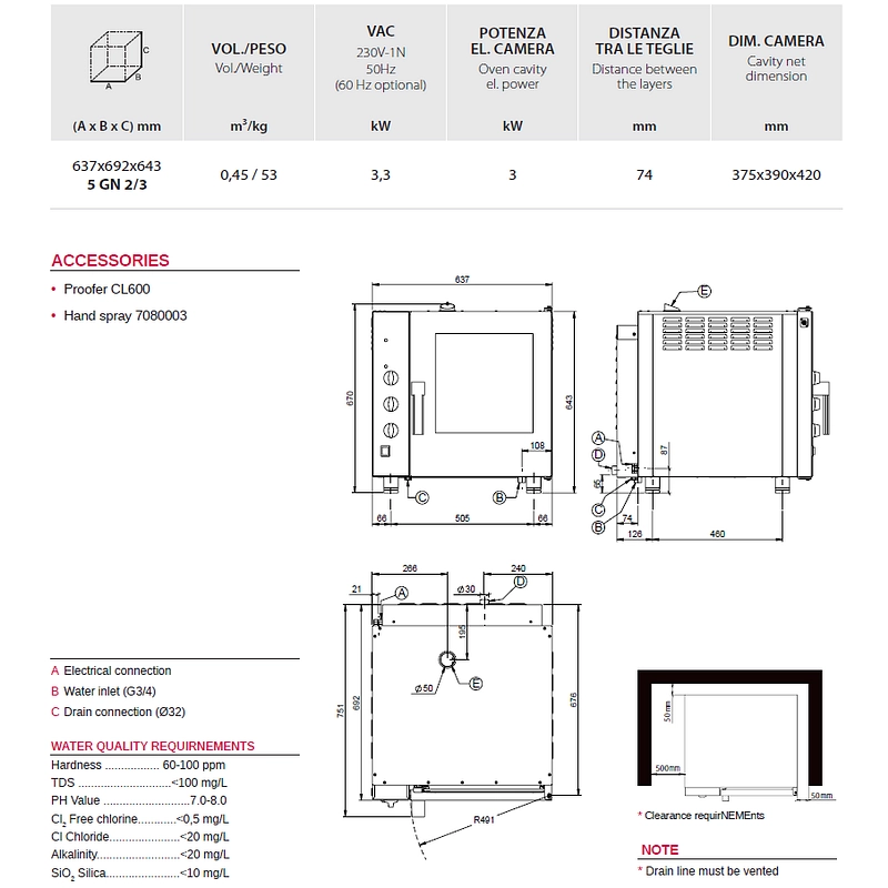 Porte à double vitrage avec grande surface vitrée. Canal d’air pour la ventilation de la vitre extérieure pour limiter la température de la surface extérieure. Fermeture de la porte par pression et réouverture par décrochage. Poignée métallique extrêmement résistante aux chocs et aux hautes températures. Joint en silicone placé sur le dormant pour assurer une étanchéité maximale et éviter toute chute de température. Chambre de cuisson avec angles arrondis pour le respect des normes d’hygiène et pour faciliter le nettoyage. Échelles fixes, démontables pour le nettoyage, compatibles GN 2/3 Inverseur de rotation du ventilateur pour une uniformité de cuisson optimale.