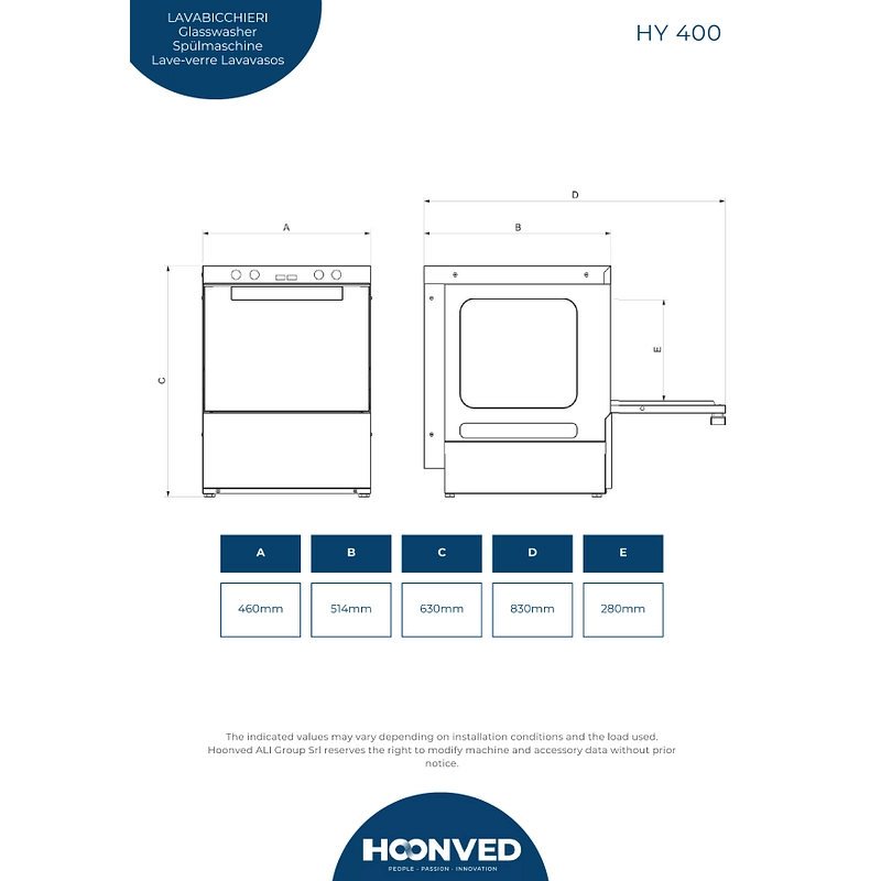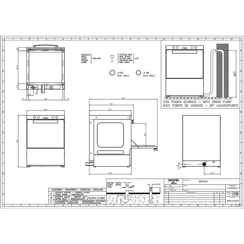 Lave-verres et lave-vaisselle, paniers 400x400, Passage 280 mm, pompe de vidange intégtrée