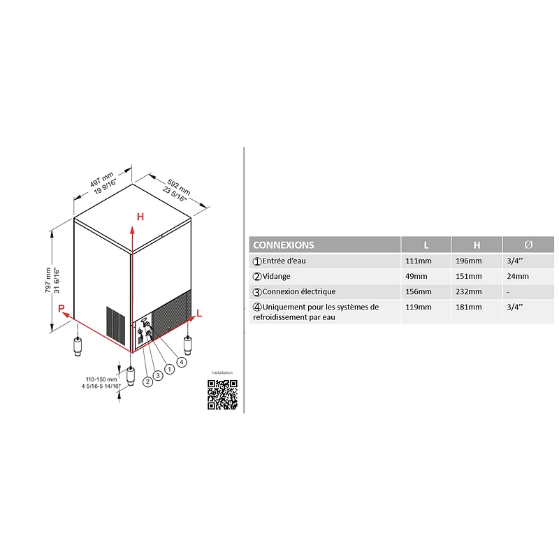 • Livrées avec tuyau d’arrivée d’eau, d’évacuation et pelle à glace.
