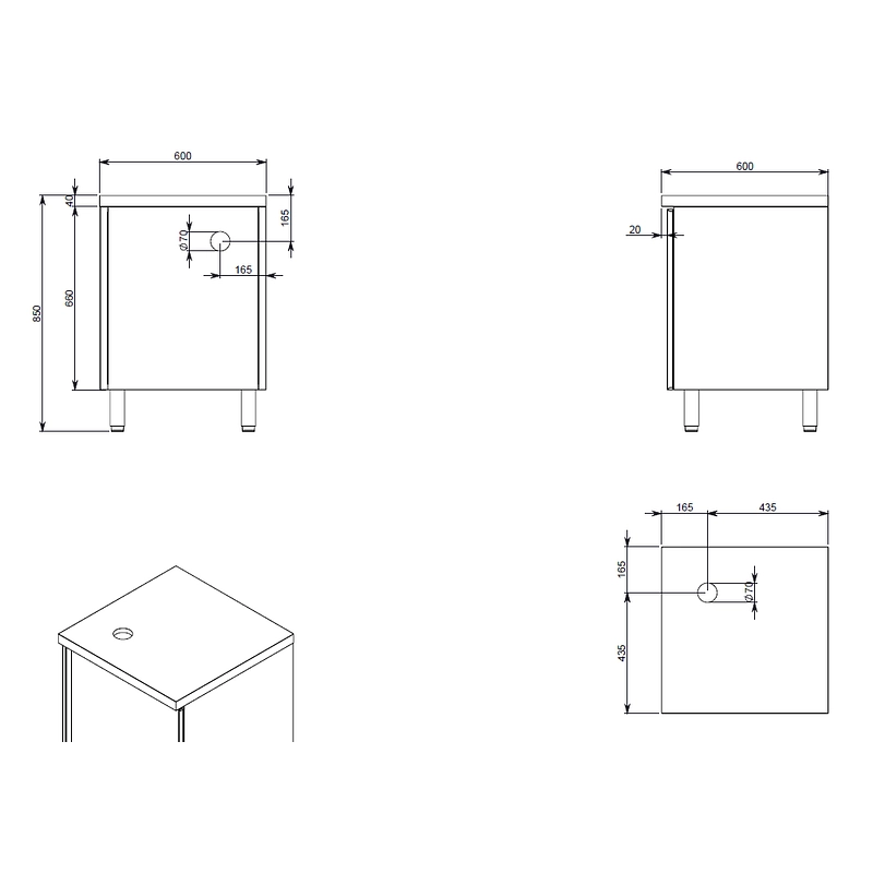 Table Inox de largeur 600mm, idéale pour poser un appareil Qeamer 230V Mono ou 400V Tri. Perforation sur le plateau de diamètre 70mm, pour évacuation des eaux de rinçages et condensats.