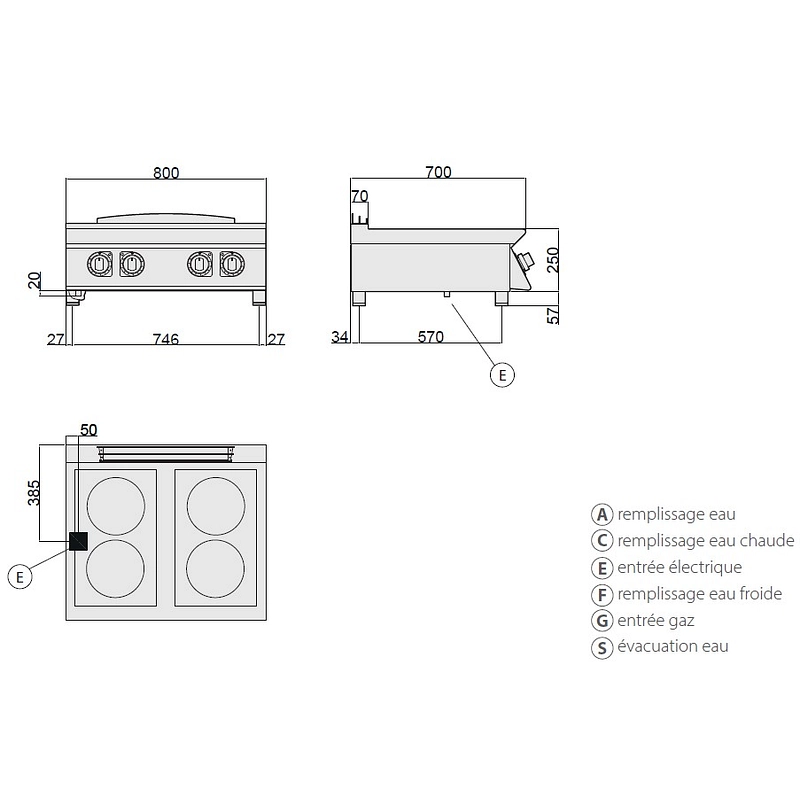 Carrosserie en acier inox. Dessus embouti avec épaisseur 15/10ème. Pieds relevables pour mise à niveau. Panneau de commandes incliné vers l’utilisateur. Épaisseur plaque vitrocéramique de 6 mm. Commutateur 6 positions et voyant de fonctionnement. Zones de cuisson délimitées par des contours sérigraphiés sur le verre. Puissance des plaques : 2,1 kW / plaque. Voyant lumineux.